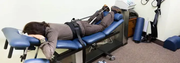 During spinal decompression therapy, patients will remain in clothes and lie on the table. The harness will be placed around the hips and attached to a traction machine which will control the tension and weight it will use to distract the spine.